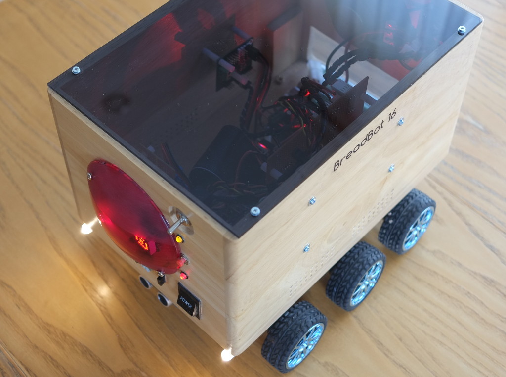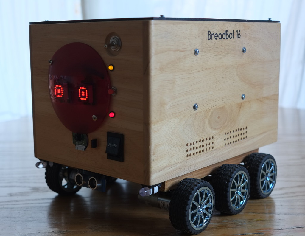 BreadBot-16 is a small, autonomous six-wheeled rover based on the Raspberry Pi. It uses ultrasonic sensors for collision avoidance and can explore without human control. Alternatively it can be controlled from a Web interface, using a picture feed from a camera module. It has an amplifier and speaker for audible (spoken) feedback. The whole thing is built in a small breadbox, for no better reason than that I happened to have one, and it was about the right size. Animated "eyes" at the front give visual cues to the decision-making process when the unit is operating autonomously.