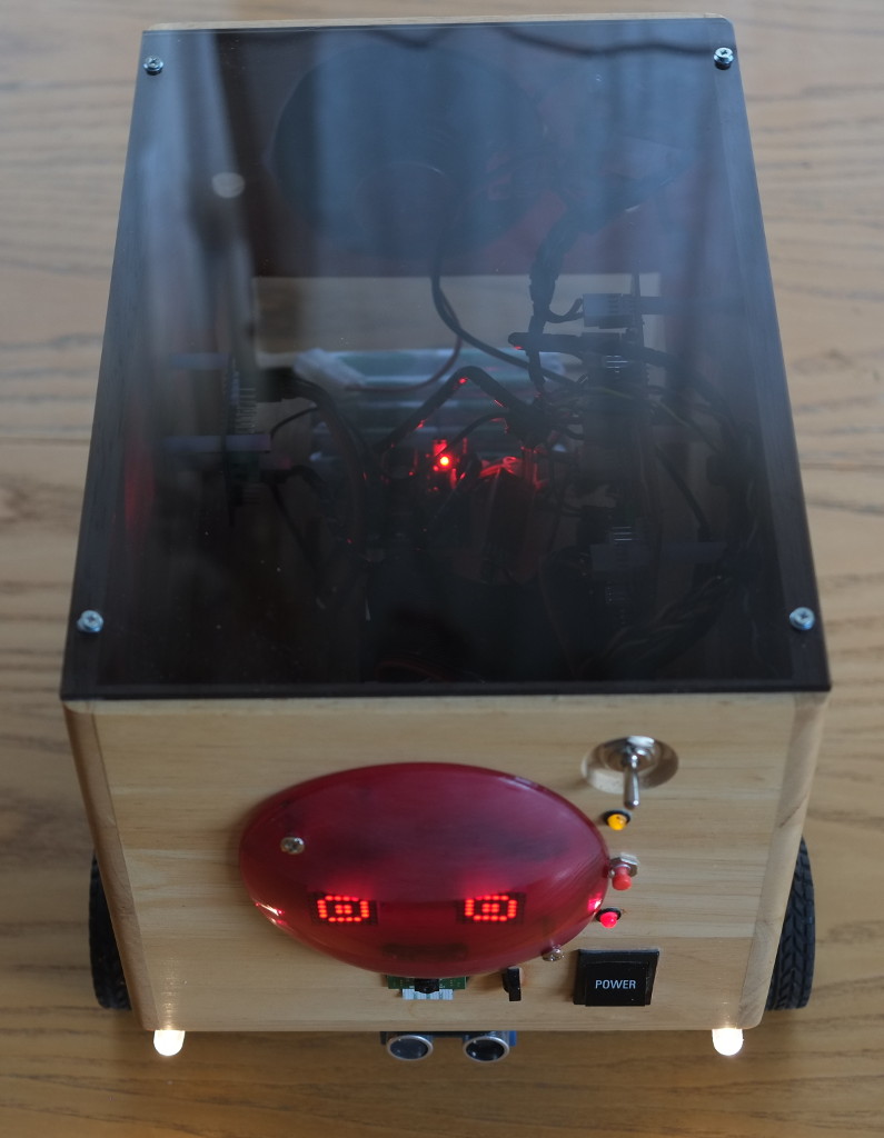 The smoked acrylic lid allows the internal workings to be seen -- whether that's a good thing is a matter of taste, of course. However, it reduces the weight considerably, compared to the original, inch-thick wooden lid. The other LEDs on the front show the status of the 12V and 5V power supplies. The red dome is a photographer's lighting gel, which just happens to be a perfect match for the colour of the light from the LED "eyes", masking the electronics and wiring of the Adafruit LED modules. Below the dome are the camera module and infrared light sensor.