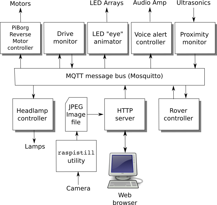 I organized the software this way in the hope that it will be more adaptable -- the modules are loosely coupled and can easily be swapped in and out. They are of varying complexity: the 'Headlamp controller' module just listens for notifications and switches a GPIO pin accordingly. The 'Rover controller' module, on the other hand, integrates messages from the proximity sensors, and uses a fairly extensive finite state machine algorithm to make steering choices. The HTTP server provides the manual control interface, as well as feeding images back to the user.