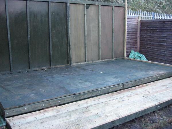 I decided to make the base 16'x8' (or, more precisely, the metric equivalent 2440mm x 1220mm), with a 16'x4' deck to the front, so I could use standard-sized building materials with the minimum of cutting. Cutting is straightforward with the appropriate tools, of course, but measuring for cutting is time consuming. I could have made the front-to-back size greater than 8', but the next standard size up would have been 12', and that's just too big for my garden.