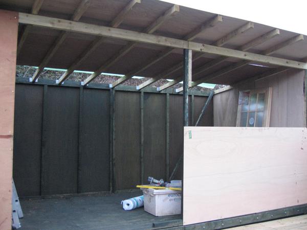 Oh well. I made the ceiling with the same cladding as the walls, and insulated it the same way. I did consider using 8"x4" sheets of 6mm plywood for the ceiling, and I got as far as fastening a couple of sheets up to see what they looked like. For reasons I don't quite understand, they made the ceiling look much lower -- an effect that wasn't apparent with cladding. Of course, plywood would have been enormously cheaper, and taken a fraction of the time to fit.