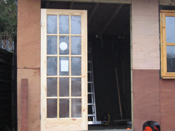 Unfortunately, I couldn't get any suitable exterior doors from an auction, or even recover them from skips as I have for other projects. So I had to buy some locally from a builder's yard. These are, strictly speaking, internal doors, so I had to get busy with the wood preserver again. Unfortunately, even though the doors are still sound twenty years later, they swell and shrink with the weather. I shouldn't have been so cheap, and bought proper external doors.