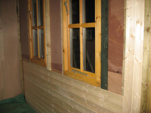 Sadly, time has revealed the errors in my thinking. It gets very warm in the Kabin in summer, and the thin softwood strips expand and warp. This pushes them away from the wall, and from each other. Twenty years on, most of the strips are still in place, but they don't look as good as they did, even after repeated re-attachments. With hindsight, I should have used thicker cladding, even if it had meant strengthening the studs.