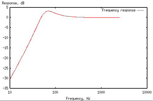 In fact, it appears that the Qtc and the cut-off frequency improve most dramatically with an increase in enclosure size from 1 cubic foot to 2 cubic feet; there is a smaller improvement from 2 to 3 cubic feet, and progressively smaller improvements after that. So in the end I settled on about 2 cubic feet as offering the best compromise. This leads to a predicted Qtc of about 1.3 and a 3dB cut-off point at 41 Hz. It also predicts a resonant peak at about 60Hz and, with a large Q, this is likely to be pronounced (see predicted frequency response below).