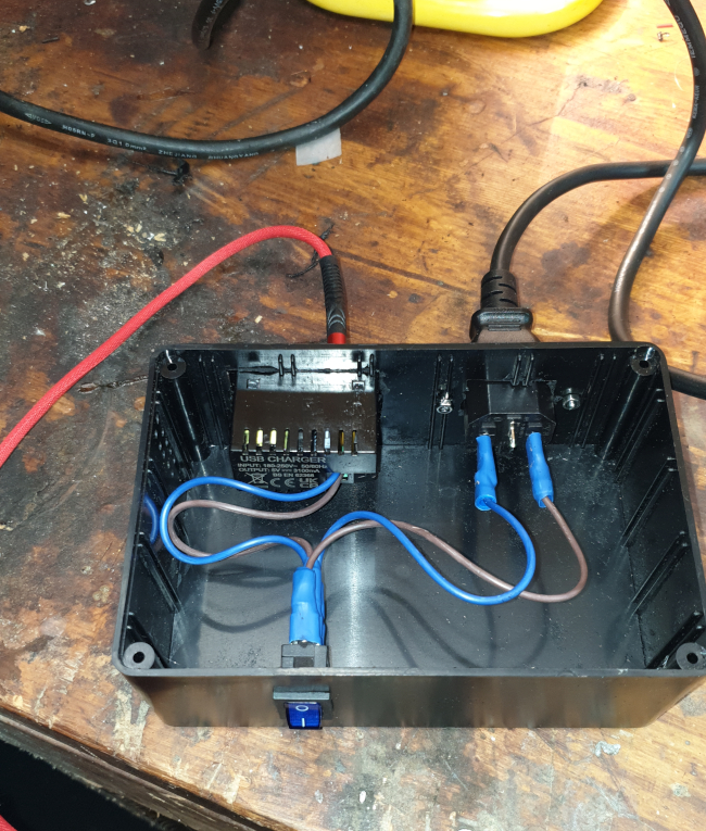 There’s nothing remotely complicated about the design of my switched USB charger. It’s just a box containing a proprietary mains-powered USB charger module, a switch, and a connector from the mains supply.